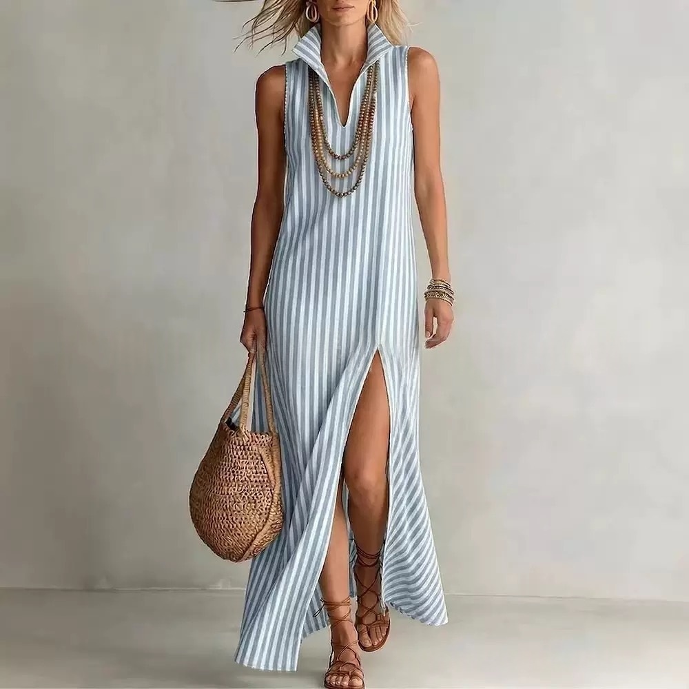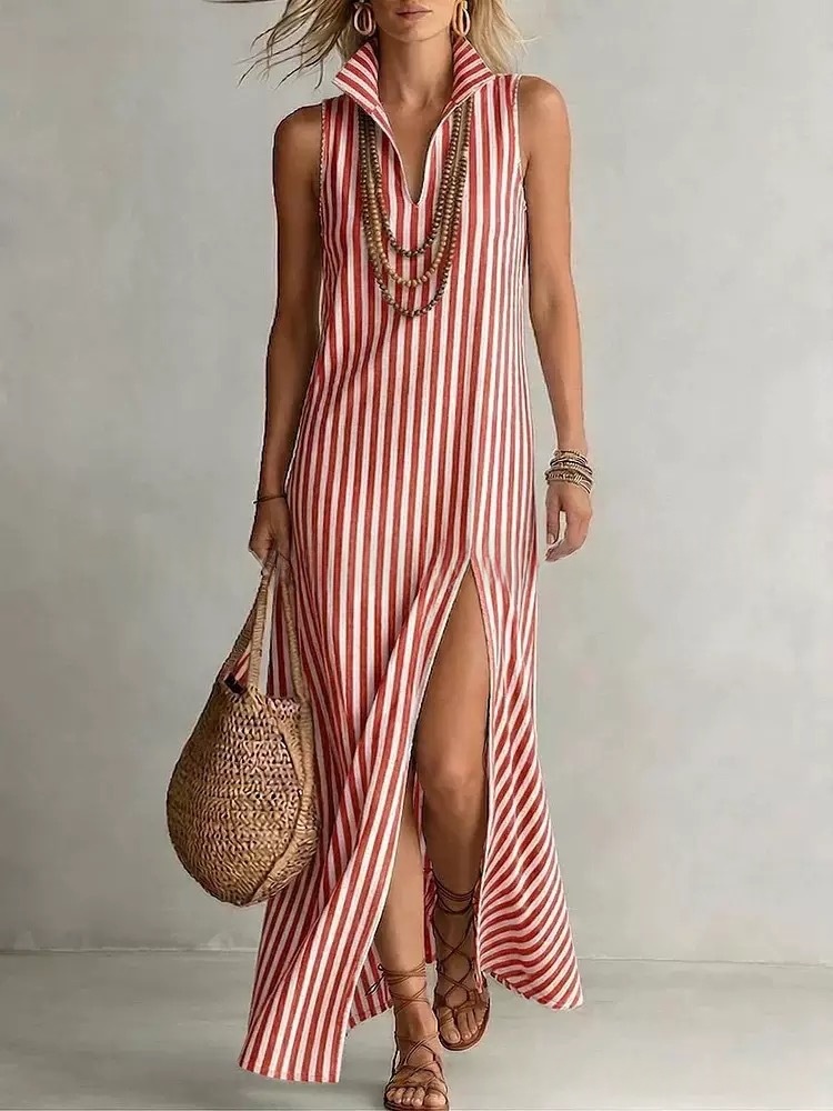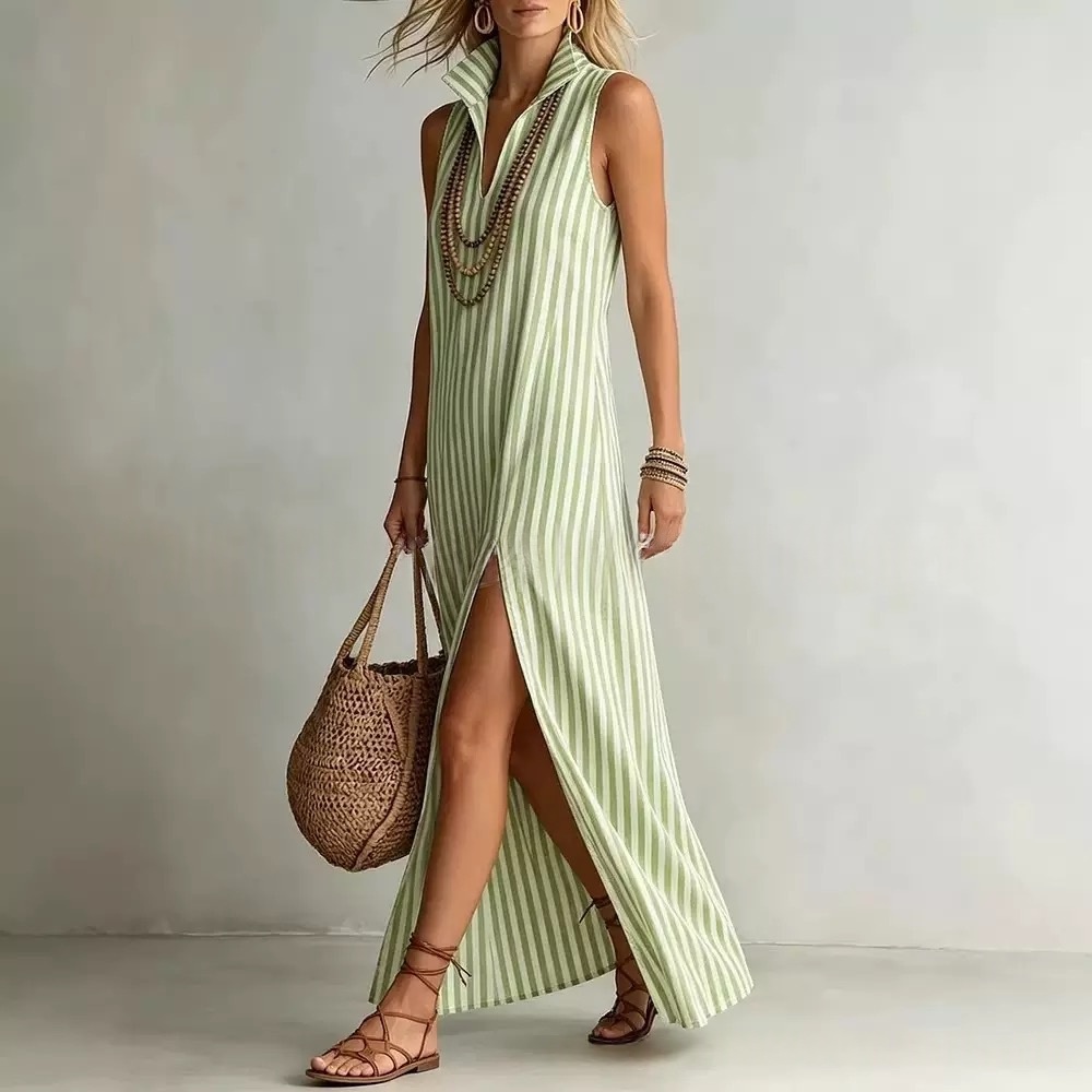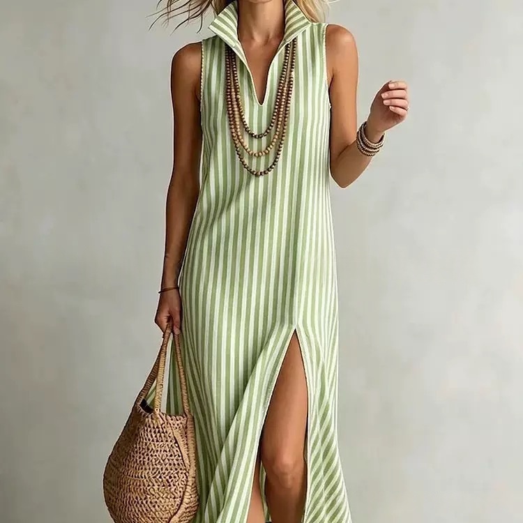 Seasonal New Womens Striped Stand Collar Side-Slit Camisole Dress